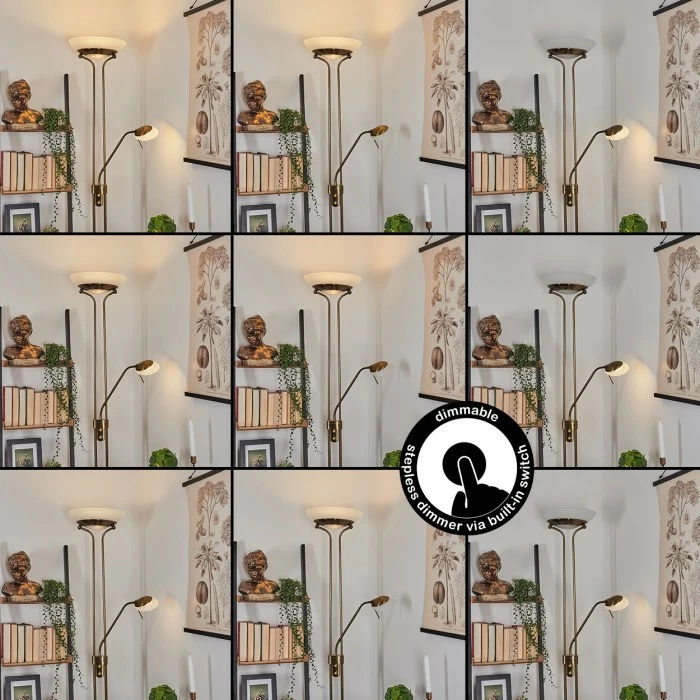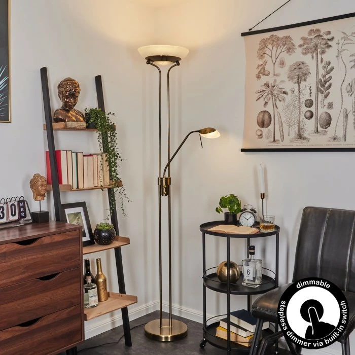 Diese Stehleuchte verfügt über einen An-/Ausschalter am Gehäuse, sowie einen Tastdimmer.